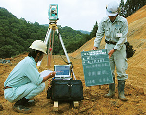 ご承知の通り、総合評価落札方式でポイントとなる技術評点を向上させるには、技術提案の内容がとても重要になります。そして、本工事では、この技術提案のテーマが「切土の出来形管理について」だったんです。そこでインターネットなどでいろいろ調べ、研究して、トータルステーション(TS)とEX-TREND 武蔵 Landcomを使った出来形管理を提案しました。……当社としては初挑戦でしたが、福井コンピュータのホームページで「情報化施工」の紹介を見て、これなら私たちにもできるし、現場の効率化にも繋がると思ったんです。