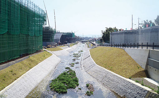 京都第二外環状道路(以下「二外」)建設工事のうち、当社は長岡京工区を受注しました。二外の工事は国交省の工区と西日本高速道路(株)の工区に分かれているのですが、長岡京工区は国交省の工区となります。この工区では高架橋本体の建設工事とは別に、すぐ脇を流れる河川の付け替え工事がありました。具体的にいうと、蛇行している川を真っすぐに整備するというもので、この現場でTS出来形を使用しました。