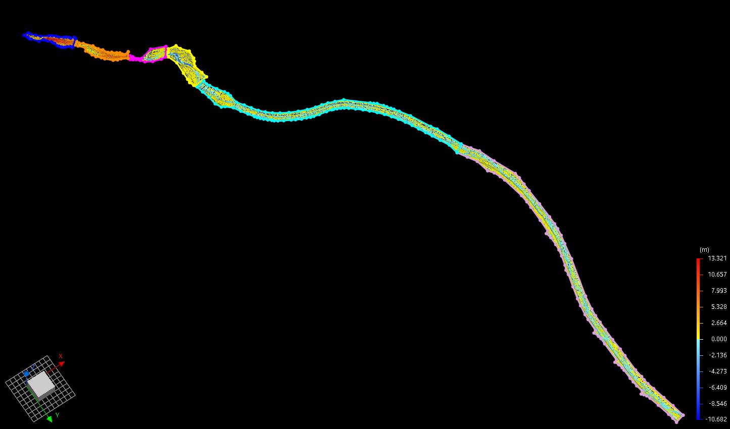 もちろんです。最近の例では、昨年の台風19号の災害復旧関連案件で、先方がUAVレーザーを使って観測したデータを元に解析を依頼され、総延長15km弱の砂防河川の土量計算を行いました。山間地の砂防河川では、台風の豪雨で上流から大量の砂や石が流れてくるのを砂防堰堤が止めていますが、昨年の台風19号で実際どれくらい土砂を堰き止めたか……砂防事業の効果を確認したいという狙いでした。そこで元の地形データと台風後に採った新しい点群を重ね、ヒートマップで分かりやすく現しました。