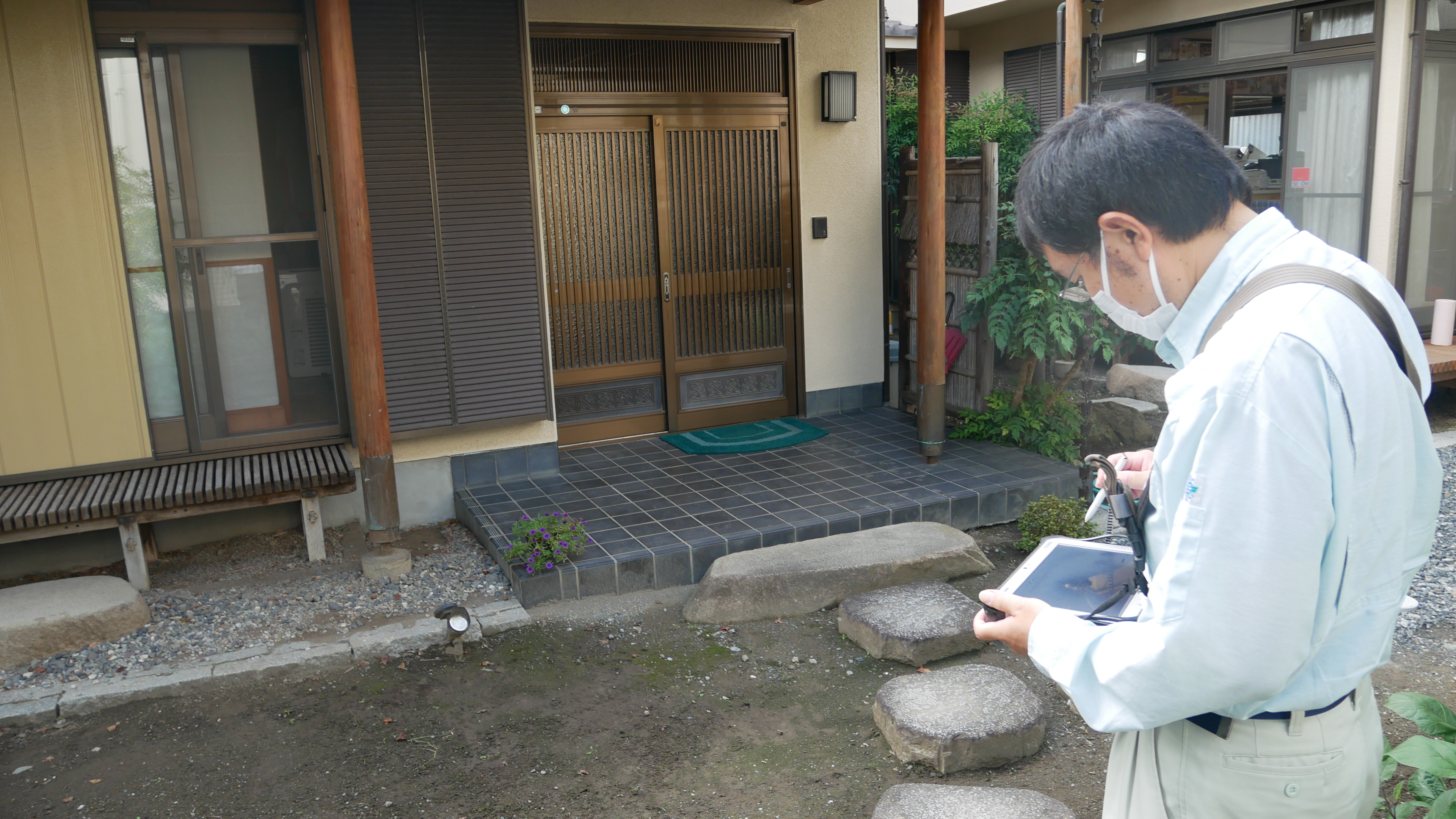 通常、家の中の調査を3~4人、外回りの調査を2人で進めます。一般の住宅であればこの5~6人で行って半日程度。極端に大きなお住まいでも一日で済ませます。ただ、住宅内部の写真を撮ったりするので、住人の方にはかなり気を遣います。作業に時間をかけ過ぎないよう、TREND-FIELD等を使ってできるだけ効率的に進めなければなりません。