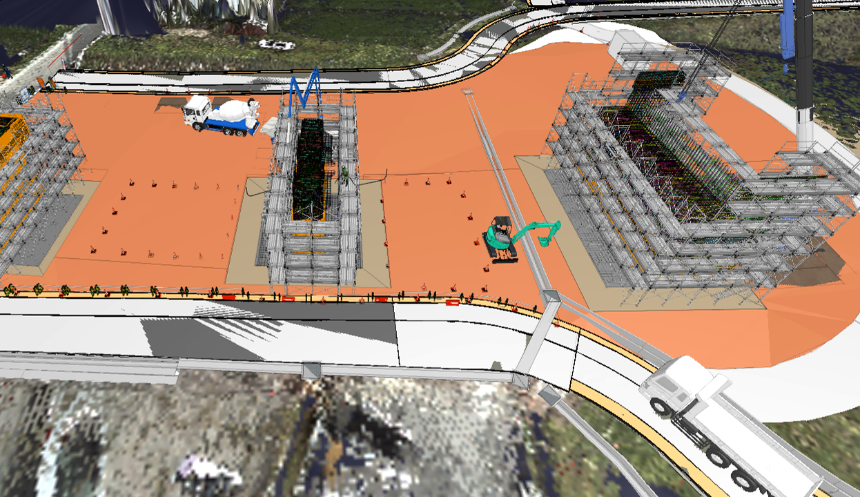 私が担当しました。専門業者に作ってもらった鉄筋配筋モデルと橋脚の躯体モデルを、3D測量した点群データからTREND-POINTと武蔵で作った地形モデルデータに合成し、TREND-COREで施工手順のモデルや重機や機 械、安全用設備等の配置モデルを作りました。