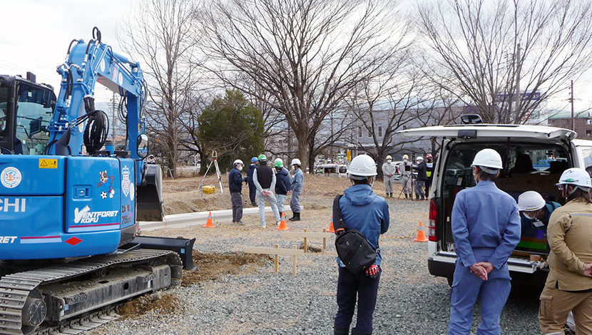 山梨県県土整備部によるICT施工の普及としては、ここまで紹介した以外にもさまざまな取り組みが始まっています。令和2年度には国交省・甲府河川国道・富士川砂防や、県内の建設業関係者に呼びかけて山梨県i-Construction推進連携会議を立ち上げ、山梨県ならではのICT活用方法について協議を重ねてきました。たとえば、前述した小規模ICTの普及の方針もここでの議論がベースにあります。さらに、この小規模ICTを受注者に広く知ってもらうため、昨年から受注者を対象に小規模ICT施工体験会や講習会も実施しているとのことでした。
