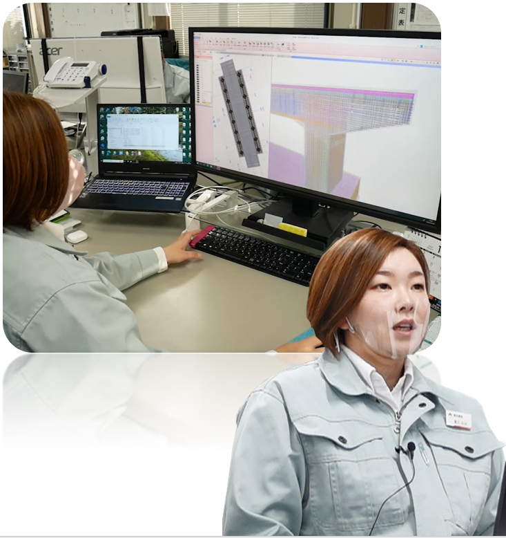 私は元々事務職だったのですが、現在は皆さんが工事で使用する3Dモデルの作成業務を主に担当しています。学生時代に建築系の勉強はしていたのですが、CADに触るのは約10年ぶり。独学で3Dモデリングを勉強し、半年ほどで現在のスキルを身に付けました。ICTを現場で活用することで、現場は省力化できていると聞いていますが、3Dモデルの作成にはやはり時間を要します。この先AIの発達などでよりICTが効率的なものになることを期待しています。