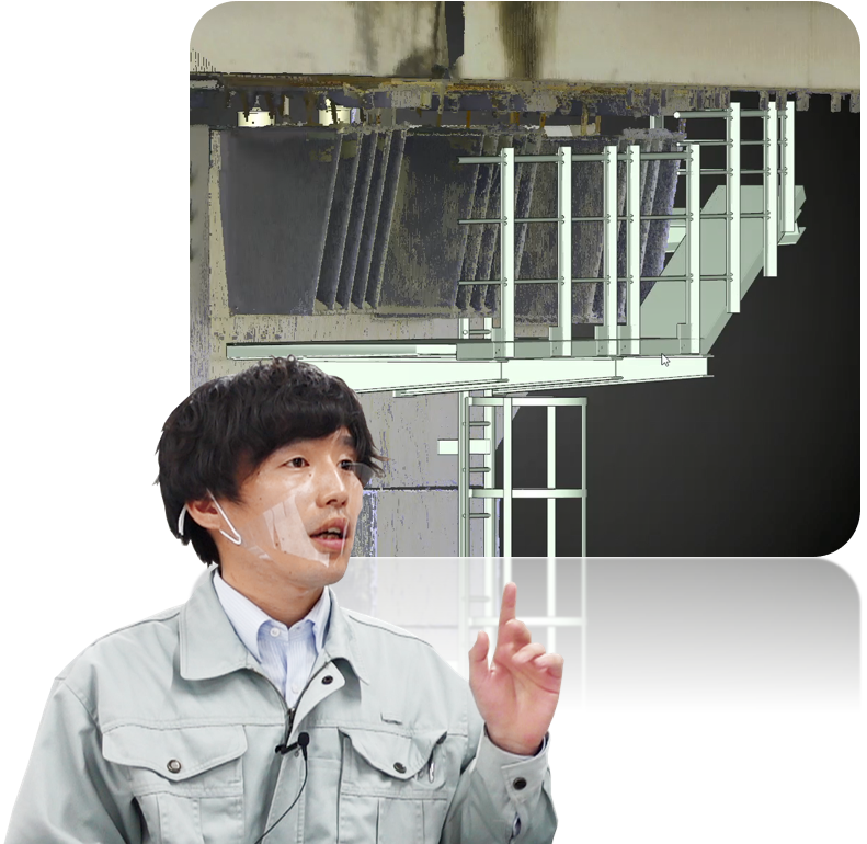 橋脚の耐震補強工事で、既存橋脚に鋼製ブラケットと、その点検用の検査路の設置工事で、それぞれの構造物が干渉しないか確認するために、鋼製ブラケット施工後に点群を採り、検査路の3Dモデルを使って工事関係者との協議に活用しました。やはり施工誤差などによってミリ単位のズレが生じる場合もあり、複雑な取回しの検査路が設計通り設置可能かどうかを立体的に確認できたことで、施工もスムーズに進めることができましたね。