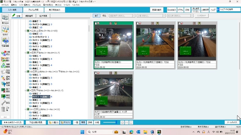 「EX-TREND武蔵」の写真管理で整理しています。この現場は3地区に分かれているんですが、技術者の方も始めたばかりなので、写真を撮って「ここにとりあえず入れとけ!」って同じフォルダに写真が入ってくるため、それを自分たちが工種や地区ごとに分ける作業をしています。