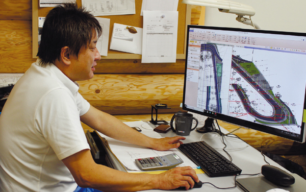 私は測量畑なのでTREND-ONEを使っており、そのため福井コンピュータ製品への切り替えもスムーズでした。ですから、ICTの展開もTREND-ONEを組み込んだ流れで行っています。3次元設計データを作るにあたって、元請けからもらった設計図面を読込み、路線計算して縦横断図を作り編集する作業が必要なので、TREND-ONEを使っています。そこから図面を起してEX-TREND武蔵へもっていくスタイルなのですよ。