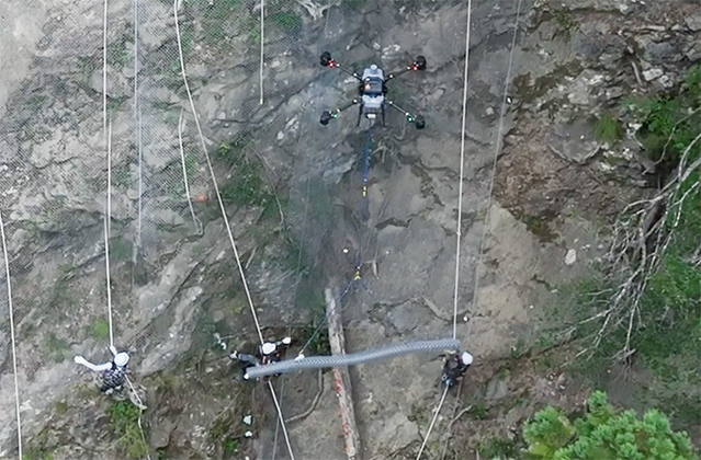 はい、私たちが力を入れているのが“運搬用ドローン”です。法面工事では、40kgの金網ロールを3,000㎡分、わずか3日で運びました。通常はモノレールで運搬し、30日ほどかかりますが、ドローンを併用した結果、工事全体が6日で完了。24日の工程短縮ができました。