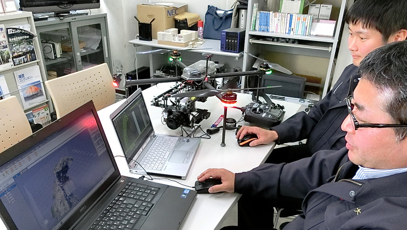 すでにi-Construction現場も2つ進めているほか、文化財関連の3D計測も積極的に提案しています。点群利用は災害現場での活用なども考えられますね。法規制との兼ね合いは有りますが、災害直後の現場にドローンを飛ばし、点群処理すれば復旧計画にいち早く活かせるでしょう。被災直後の現場作業は危険を伴いますから、リスク管理としても有効です。とにかくレーザースキャナーとドローンを現場に合わせて使い分けながら、いろんな現場で積極的に活用していきます。