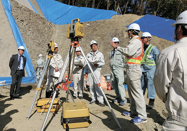陸上土木はもちろん、港湾土木や浚渫、さらには住宅づくりを初めとする各種建築まで幅広く展開する山陽建設(三原市)は、新技術導入に積極的な企業として知られています。土工分野でも早くから3次元データの活用に取組み、2016年には国交省発注工事でi-Constructionを実施。いまや他の一般工事においても、培ったICT技術を幅広く応用しています。その現状と成果について伺うため、現場見学会を実施中の同社ICT活用現場に担当の中路恒平氏をお訪ねしました。