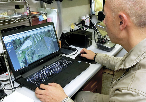 地権者の方は高齢者が多いのですが、境界確定の立会い等ではその地権者さんに境界について質問しなければなりません。ところが2Dの図面を見せながら聞いても、「分らない」と言われがちです。ところがこのオルソ重ね図を見せると、とたんに95歳のお爺さんが「そうだそうだ」と言いだすんですよ。「境界は確かにこうだ」と。重ね図のリアルなビジュアルは、一般の方でも現況との比較がしやすいので、確認作業をスムーズにするために大いに役立っています。