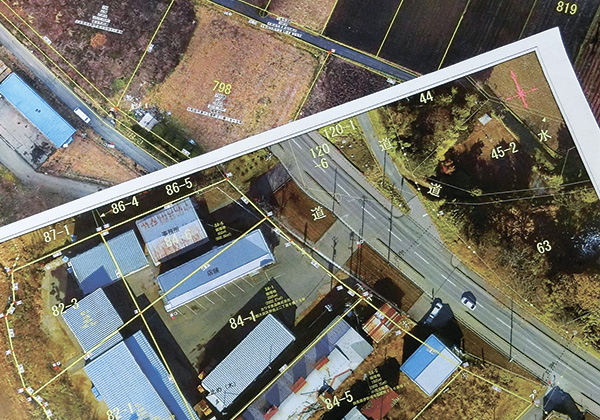 ええ。たとえば境界判定を依頼された土地をドローンで撮影しオルソ画像を作ったら、それをTREND-POINT等を使って地図の筆界と重ね合わせ、一種の「オルソ重ね図」を作るんです。すると土地の境界も、建物も、工作物も、全てひっくるめて「どこに何があるか」一目瞭然で理解できる重ね図となります。強力で汎用性の高いビジュアルツールの出来上がりです。