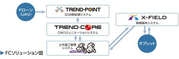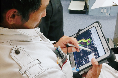 4月にEX-TREND武蔵とTRENDCORE、X-FIELD。そしてTREND-POINTも入れました。これらにドローンを加えたソリューションが、われわれの新たな業務スタイルの核ということになります。武蔵は技術者1人1台体制とし、以前の他社システムから一気に切り替えました。TREND-COREはとりあえず2台ほど導入し、私と蒲野専務がCIMモデルの作成を行っていますが、これも徐々に全員へ普及させていく計画です。またX-FIELDの導入により、現場でのタブレットの活用、武蔵との連携も本格化していますね。