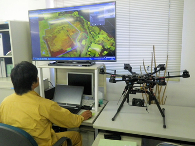 UAVで空撮した写真から3D点群データを作成し、<br>福井コンピュータの「TREND-POINT」で土量計算を行う大林組の現場事務所