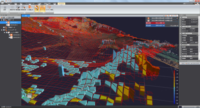 例えば月末ごとにUAVで現場を空撮し、先月末と今月末の3D点群データを作っておけば、これらのデータをTREND-POINTに読み込むだけで1カ月間の盛り土、切り土の量が3次元CADのように計算できるわけです。