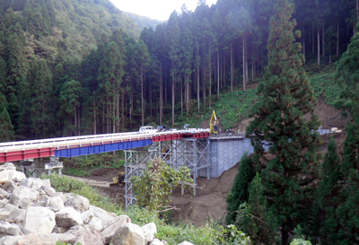 ええ、非常な急峻地でしかも大きくカーブしていて……元々は対岸に渡る架橋を付けてから山を切り、道路を入れていく入り口の工事で、実際はこの架橋段階から様々な問題がありましたが、照査の時から対策を考えてここは何とか進められました。しかし、対岸になってからの地形が問題で、勾配がきつすぎて、通常の丁張り作業などとてもできそうにない状態だったんです。