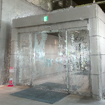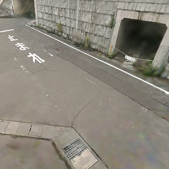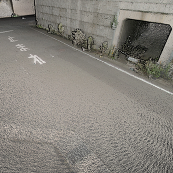 3DGSによる表示は、一般的にレーザースキャナー等で取得する点群データよりも密度の低い点群によって生成されますが、非常に写実的なモデル再現に優れております。特に看板等の文字やコンクリートのクラック、微細な凹凸やガラスなどの被写体は、従来の点群に比べ圧倒的に鮮明に再現されるため、これまでの計測用途のほかに、インフラの維持管理調査業務や災害記録、遺跡や文化財などの記録(デジタルアーカイブ)として活用いただけます。