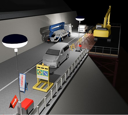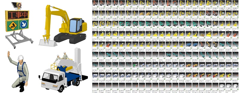 バックホウ、ダンプトラック、杭打機、高所作業車などの重機や、足場、矢板などの仮設材、カラーコーン、誘導員などの部材など、3Dモデルに配置するだけで現場を再現できる3D部品を多数搭載しています。また重機の可動部が動かせるため、様々なシミュレーションを支援します。