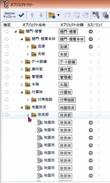 3次元モデル成果物作成要領(案)に示されている、オブジェクトの階層および分類に準拠したツリー構造に対応したテンプレートを備えています。
