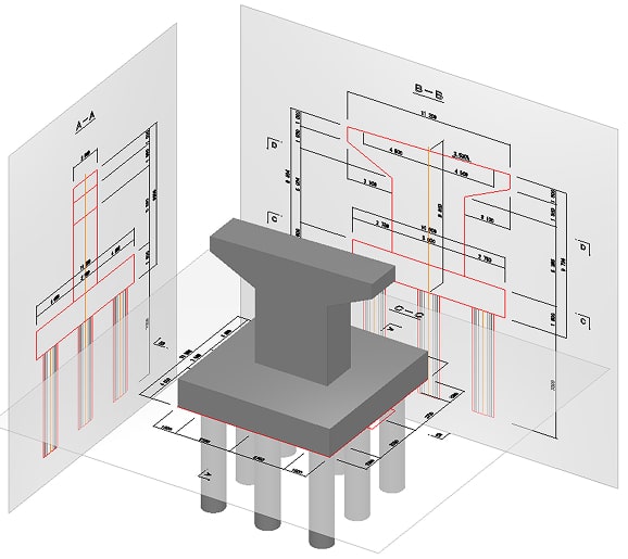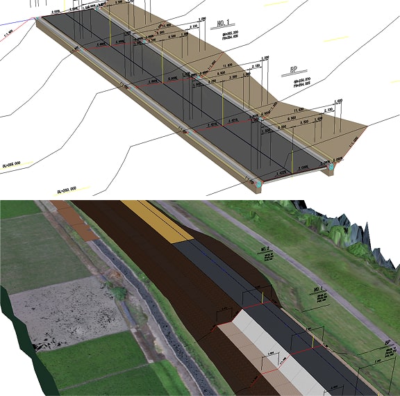 平面図や横断図など、2Dの発注図から手間なく3Dモデルが作成できます。