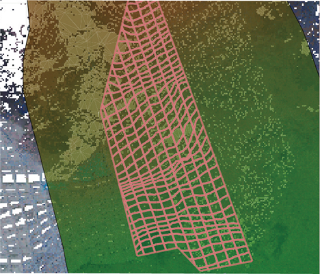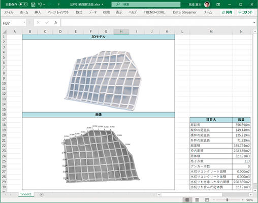 点群などの現況地形に沿って、法枠モデルを自動生成します。施工面積や材料毎の数量などをExcelに出力できます。