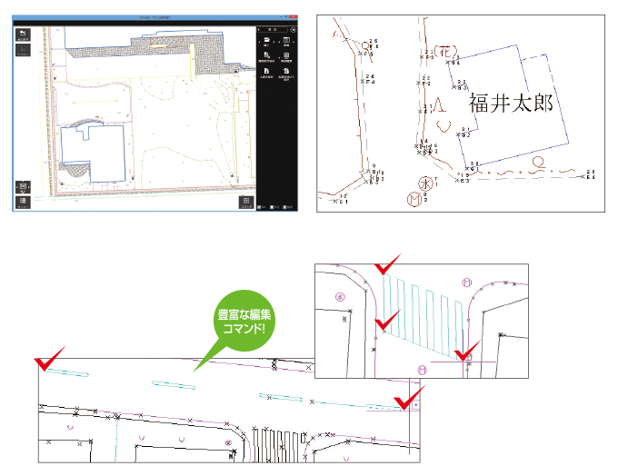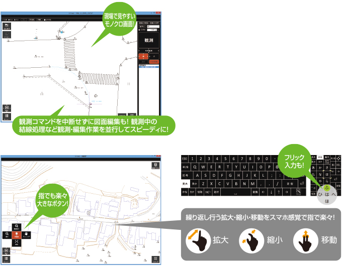 現況平面図作成や敷地調査など現場での観測をその場で絵柄で即確認! 豊富な編集コマンドで簡単図化!