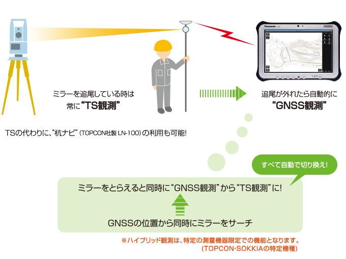 GNSSとTSを同時に接続した状態に保ち、TSで測れない状態の時にはGNSS観測に切り換えます!
