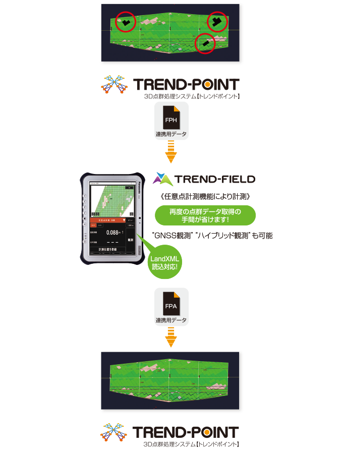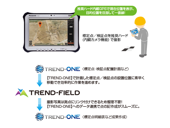 GNSS単点観測機能搭載! 観測データを【TREND-ONE】に取込み“単点観測点検表”の作成も。