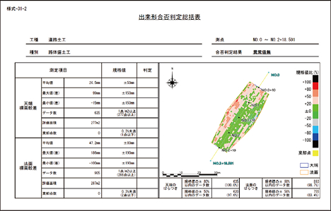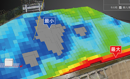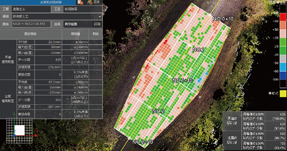 国土交通省の出来形管理要領(港湾含む)や、農林水産省の情報化施工技術の活用ガイドラインに対応した出来形管理に対応できます。出来形点群と設計の差異をヒートマップで表現し、出来形管理要領で求められる評価情報も画面上に表示。出来形管理図表などの成果出力も可能です。