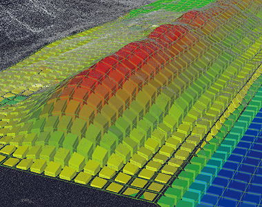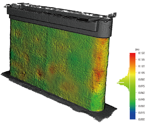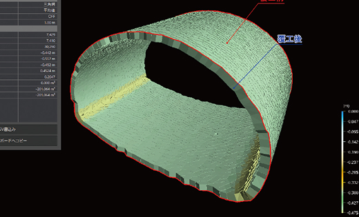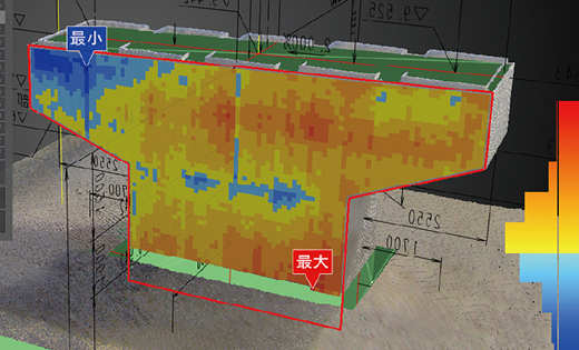 ベクトル差分解析(オプション)では、点群や三角網(TIN)から、主に構造物の設計値と出来形、コンクリート吹付や巻き立て、構造物の経年変位など、その差分を視覚化した解析が可能です。ICT構造物工(橋脚・橋台)編の出来ばえ評価への対応を始め、幅広いシーンで活用できます。