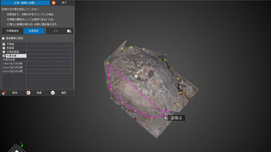 点群の範囲を指定することで、面積や土量、災害崩落部分などの体積を簡単に計測することができます。また、メッシュ土量計算(オプション)では、土木工事数量算出要領(案)における、メッシュ法(点高法)や三角網による土量計算(プリズモイダル法)に対応しています。