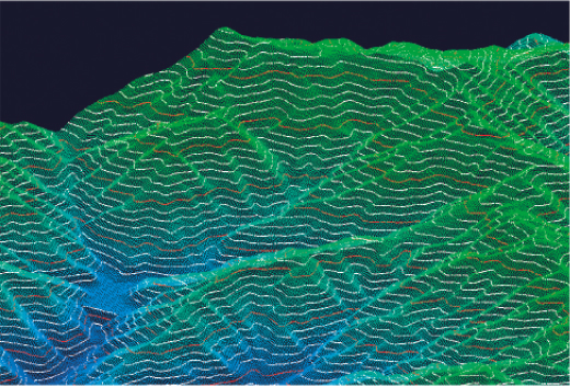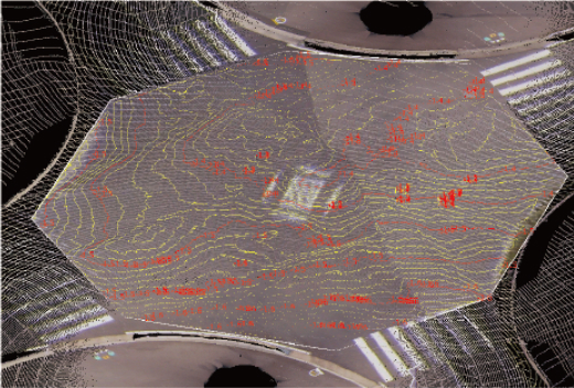 点群から等高線を作成できます。等高線の間隔を任意に設定でき、一般的な地形の等高線から、mm単位の路面変状まで対応します。DXF/DWGなどのCAD形式で出力できます。