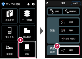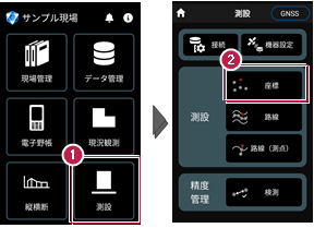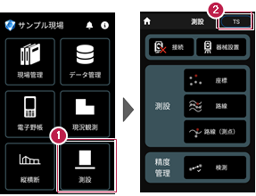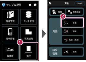 観測画面の右上の[GNSS]をタップして、TSモードに切り替えます。