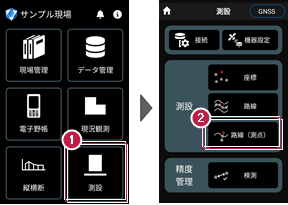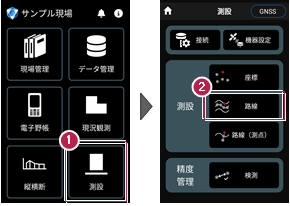 2 測設画面の[測設]の[路線(測点)]をタップします。