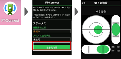 S5、S7、S9の「整準」は、FIELD-POCKETとSシリーズを接続した後に、「FT-Connect」を起動して「電子気泡管」で行うことが