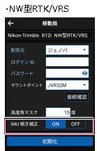 R12i のIMU傾き補正は、「NW型RTK/VRS」の移動局で利用することが出来ます。移動局の設定画面にある「IMU傾き補正」を「ON」にしてください。(初期値ON)