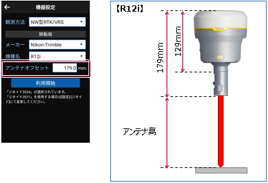 R12iは機器設定で「アンテナオフセット」を設定します。初期値は「179.0mm」です。