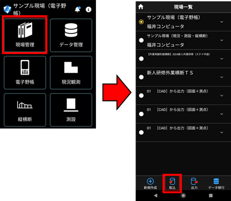 ・FIELD-POCKETで作成済みの現場に取り込む方法(「データを取り込む」参照)
