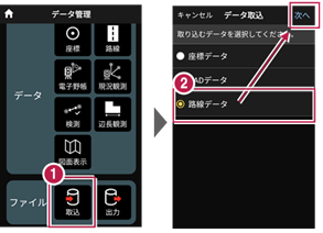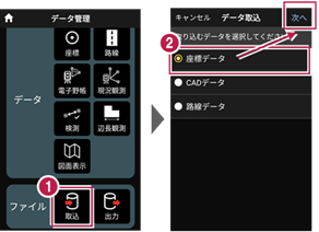2 データ取込画面の[座標データ]を選択し、[次へ]をタップします。