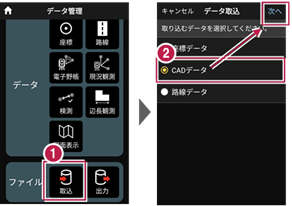 2 データ取込画面の[CADデータ]を選択し、[次へ]をタップします。