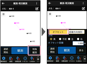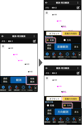 [特殊観測]の[距離方向個別]で距離、方向を選択して距離、方向を観測します。