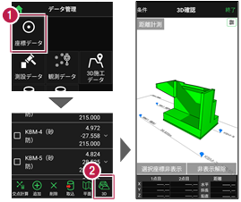 2 [測設データ][観測データ][3D施工データ]の各ボタンをタップして、記録したデータを確認します。