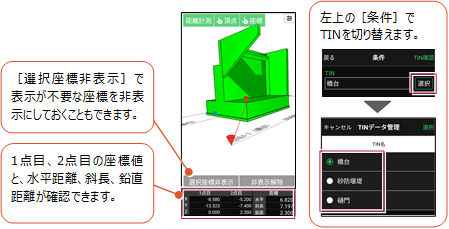 [データ管理]-[座標データ]の[TIN確認]をタップします。