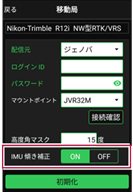 R12i のIMU傾き補正は、「NW型RTK/VRS」の移動局で利用することが出来ます。移動局の設定画面にある「IMU傾き補正」を「ON」にしてください。(初期値ON)