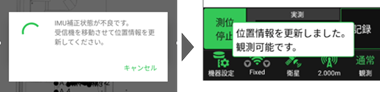 観測時に「IMU補正状態が不良です。~」と表示された場合は、GNSSを持ったまま1、2歩分位置を移動することで、観測可能になります。(下図参照)