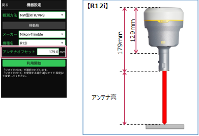 R12iは機器設定で「アンテナオフセット」を設定します。初期値は「179.0mm」です。