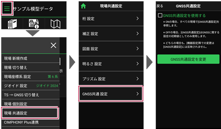 ホーム画面の[メニュー]-[現場共通設定]-[GNSS共通設定]で、GNSS観測の「観測方法」や「機種」などの初期値を設定することができます。