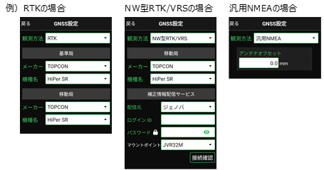 接続確認済み機器以外でも、汎用のNMEA(GGA)フォーマットを出力するようにセットアップされた機器を接続して観測をおこなうことができます。