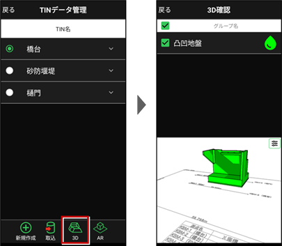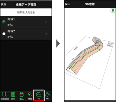 図⾯/路線/構造物データの利⽤が可能であり、「図⾯AR」では、平⾯図や横断図を平⾯投影や⽴⾯投影し、3次元設計モデルがなくとも施⼯イメージを体感できます。また「路線AR」では中⼼線形ありデータを、「構造物AR」ではTIN(中⼼線形なし)データを投影することができ、既設構造物との⼲渉チェックや不整合の確認、作業員への教育、発注者との合意形成、地下埋設物の可視化など、幅広い⽤途で活⽤が⾒込め、お客様の業務効率化を強⼒に⽀援します。