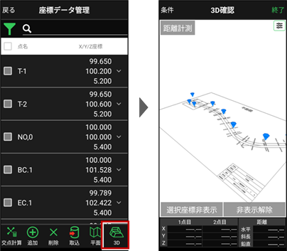 杭打ちや丁張設置などの作業において、⽬標点への誘導時にAR機能を利⽤できるようになりました。