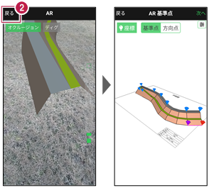1 AR基準点画面で[基準点]をタップし、路線を投影する際の配置基準点をタップして指定します。